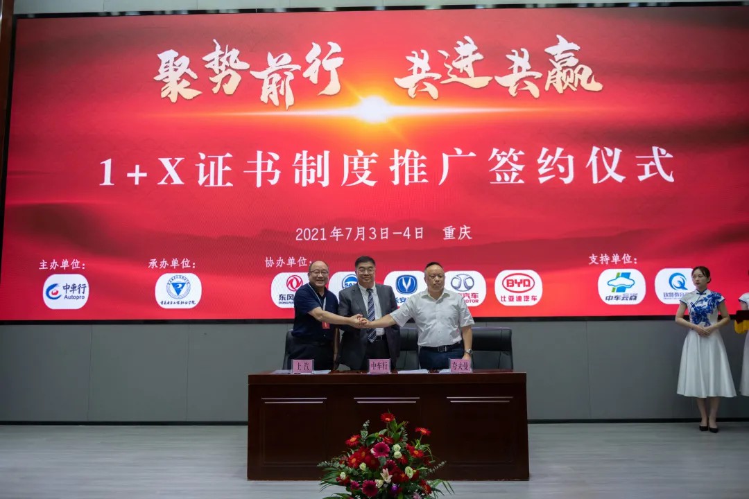 7月3日-4日,北京中车行高新技术有限公司1+X证书制度汽车运用与维修、智能新能源汽车职业技能等级证书试点工作总结交流会、暨中车行分别与东风集团、上汽集团、长安汽车、北京汽车、金龙汽车等五大汽车制造企业签约仪式在重庆举行。本次会议围绕着如何深化产教融合、校企合作,推动岗课赛证协同发展,共同研究探讨了促进汽车领域1+X职业技能等级证书制度落地生效的发展路径。国内汽车龙头企业代表、知名行业专家及1+X优秀试点院校领导、老师等300余人参会。